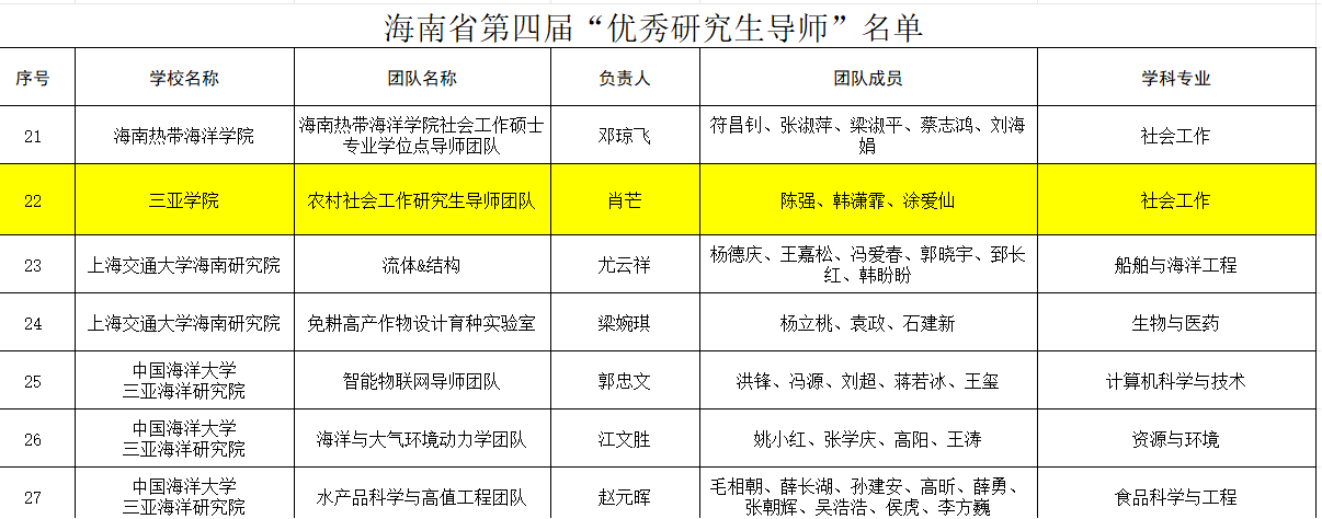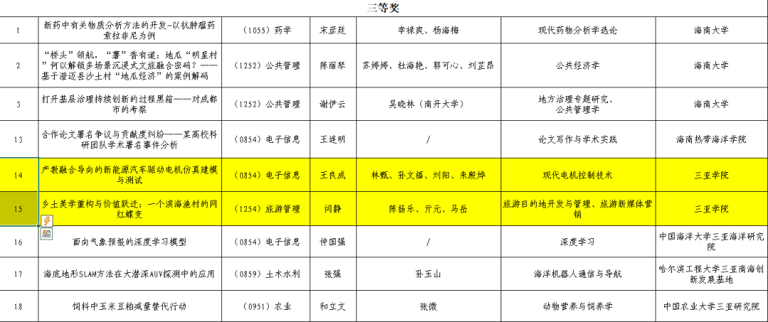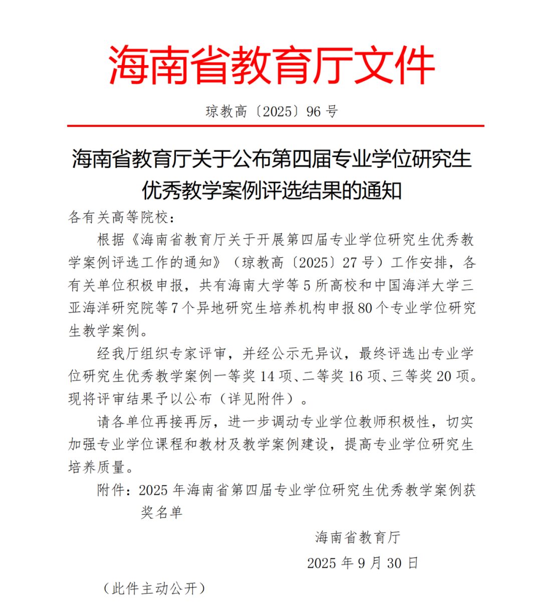 近日,海南省教育廳正式發(fā)布《海南省教育廳關(guān)于公布第四屆“優(yōu)秀研究生導(dǎo)師”和“優(yōu)秀研究生導(dǎo)師團(tuán)隊(duì)”評(píng)選結(jié)果的通知》(瓊教高〔2025〕95號(hào))及《關(guān)于公布第四屆專(zhuān)業(yè)學(xué)位研究生優(yōu)秀教學(xué)案例評(píng)選結(jié)果的通知》(瓊教高〔2025〕96號(hào))。三亞學(xué)院社會(huì)工作專(zhuān)業(yè)蘇米雅教授獲頒“海南省優(yōu)秀研究生導(dǎo)師”稱(chēng)號(hào),肖芒教授帶領(lǐng)的“農(nóng)村社會(huì)工作研究生導(dǎo)師團(tuán)隊(duì)”入選優(yōu)秀團(tuán)隊(duì);旅游與酒店管理學(xué)院閆靜副教授牽頭的《鄉(xiāng)土美學(xué)重構(gòu)與價(jià)值躍遷:一個(gè)濱海漁村的網(wǎng)紅蝶變》教學(xué)案例,以及新能源與智能網(wǎng)聯(lián)汽車(chē)學(xué)院王良成高級(jí)工程師牽頭的《產(chǎn)教融合導(dǎo)向的新能源汽車(chē)驅(qū)動(dòng)電機(jī)仿真建模與測(cè)試》教學(xué)案例,均榮獲三等獎(jiǎng)。