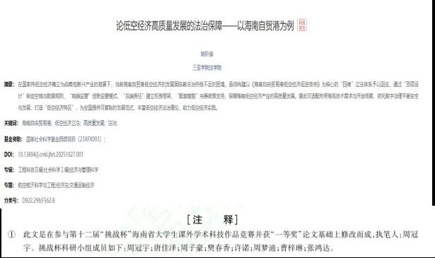 在競(jìng)賽成果基礎(chǔ)上,團(tuán)隊(duì)進(jìn)一步深化研究,在《財(cái)經(jīng)理論研究》期刊上發(fā)表了《論低空經(jīng)濟(jì)高質(zhì)量發(fā)展的法治保障——以海南自貿(mào)港為例》學(xué)術(shù)論文。文章系統(tǒng)探討了低空經(jīng)濟(jì)政策與法律體系的協(xié)調(diào)路徑,提出了構(gòu)建“有限賦權(quán)”低空空域監(jiān)管制度、建立權(quán)益保障機(jī)制等創(chuàng)新建議,為海南自貿(mào)港低空經(jīng)濟(jì)立法提供了理論支撐。