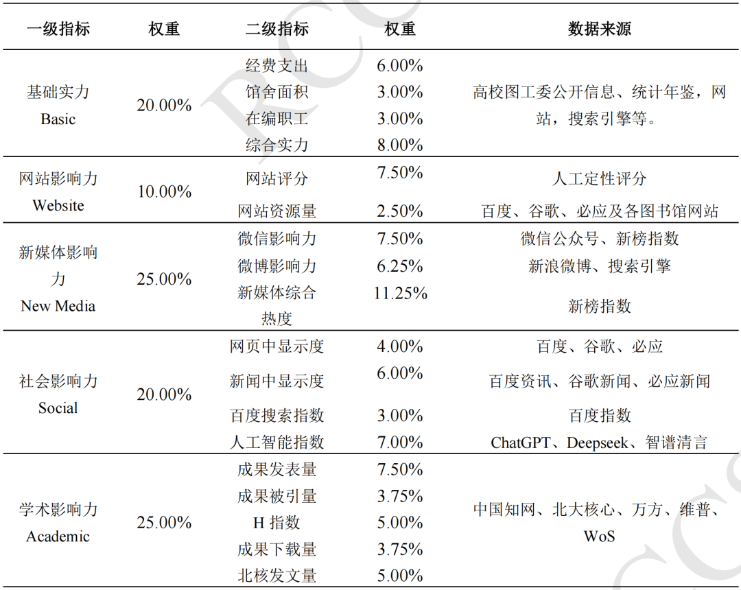 《數(shù)智時代中國圖書館影響力指數(shù)報告(2025版)》秉承“分類評價、同類比較”原則,根據(jù)數(shù)智時代圖書館影響力的構成,基于“基礎實力、網(wǎng)站影響力、新媒體影響力、社會影響力、學術影響力”五維一體的評估模型,通過多源數(shù)據(jù)采集、多輪人工校驗與交叉檢驗,對全國2919所高校圖書館、1980所公共圖書館及390所專業(yè)圖書館進行了系統(tǒng)評估。報告在數(shù)據(jù)獲取、指標構建與結果分析中,堅持公開、透明、穩(wěn)健的方法,具有較高的科學性、可比性、權威性與參考價值。