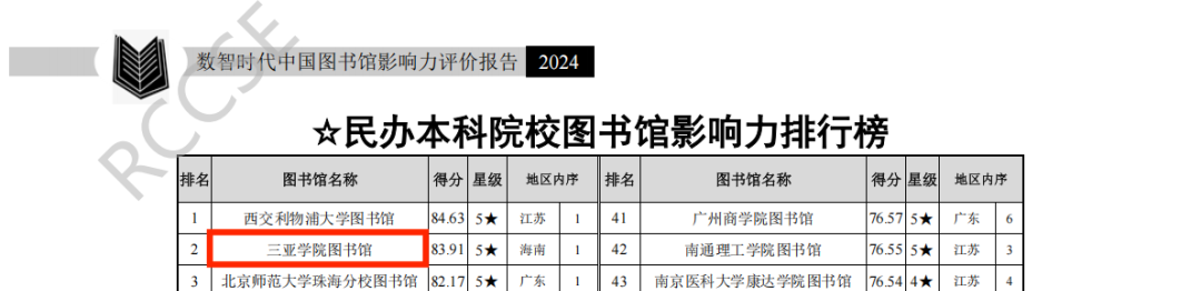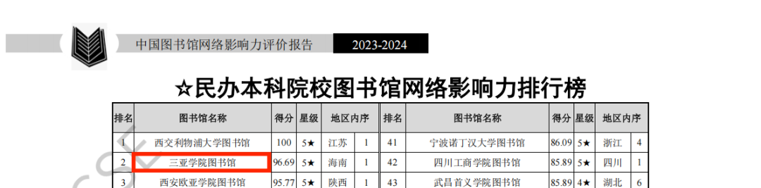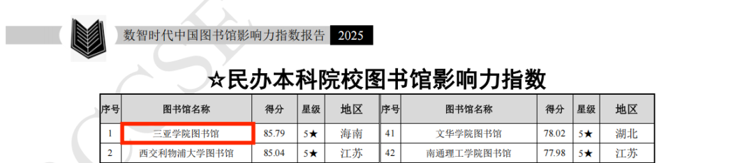 日前,由武漢大學中國科學評價研究中心、數(shù)字出版智能服務技術教育部工程研究中心聯(lián)合研究制作的《數(shù)智時代中國圖書館影響力指數(shù)報告(2025版)》正式發(fā)布。在本次評估中,三亞學院圖書館表現(xiàn)卓越,榮獲全國民辦本科院校圖書館影響力指數(shù)排行榜第一名,并連續(xù)三年獲評五星級圖書館(5★為具有突出影響力的單位,即排在最前面10%的單位)。