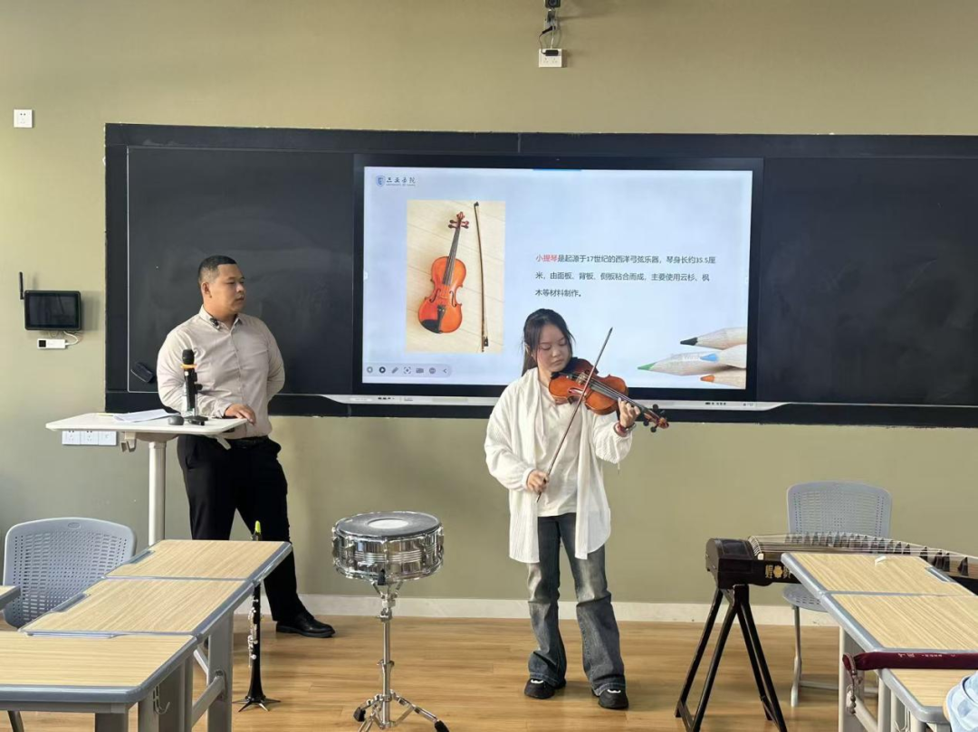郗瑞魯老師(《傳統(tǒng)器物與設(shè)計文化》)聚焦傳統(tǒng)與現(xiàn)代的創(chuàng)新融合,將AI工具貫穿藝術(shù)學習全流程,有效提升學生藝術(shù)鑒賞與創(chuàng)新實踐能力。曹實老師(《藝術(shù)修養(yǎng)類課程(音樂藝術(shù))》)課程堅守“見人見物見生活”的育人導向,巧妙銜接傳統(tǒng)文化與現(xiàn)代設(shè)計,讓藝術(shù)教學更具溫度與深度,獲得現(xiàn)場教師的高度認可。
