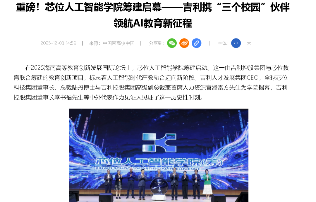 2025海南高等教育創(chuàng)新發(fā)展國際論壇上,由吉利控股集團(tuán)與芯位教育聯(lián)合籌建的芯位人工智能學(xué)院正式啟動籌建,陸丹博士與潘雷方先生為學(xué)院揭幕,李書福先生等中外代表見證。學(xué)院秉持產(chǎn)教融合理念,依托吉利產(chǎn)業(yè)積累培養(yǎng)實用型AI人才,創(chuàng)新打造“基礎(chǔ)校園+流動校園+智慧平臺”辦學(xué)模式,踐行“未來大學(xué)當(dāng)坐在AI上”理念,構(gòu)建虛實融合的全景式未來大學(xué),下設(shè)多類教研及孵化分支機(jī)構(gòu)并設(shè)吉利博士后流動站。該學(xué)院的籌建是吉利教育領(lǐng)域長期布局的重要里程碑,將推動產(chǎn)教深度融合,探索人工智能時代高等教育新范式。