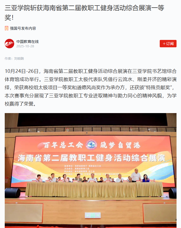 三亞學(xué)院成功承辦海南省第二屆教職工健身活動綜合展演,其教職工太極代表隊榮獲高校組太極項目一等獎及道德風(fēng)尚獎。學(xué)校通過“以賽育人”模式,將賽事組織與專業(yè)教學(xué)深度融合,為學(xué)生提供實踐鍛煉平臺。此次獲獎?wù)宫F(xiàn)了學(xué)校在推動校園文化建設(shè)和踐行產(chǎn)教融合戰(zhàn)略方面取得的積極成果。