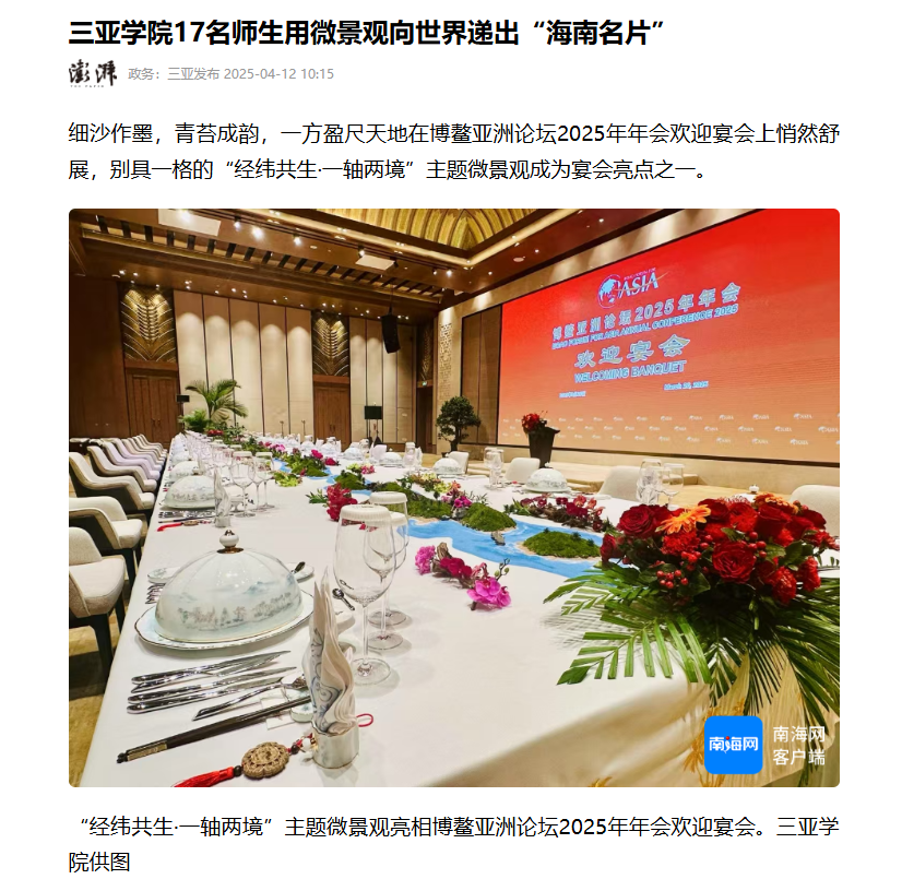 三亞學(xué)院藝術(shù)學(xué)院17名師生為博鰲亞洲論壇2025年年會創(chuàng)作了主題微景觀“經(jīng)緯共生·一軸兩境”。作品歷時96小時,在不足10平方米的空間內(nèi)巧妙融合五指山、三江入海等13處海南地標(biāo),生動展現(xiàn)了海南的自然與人文特色。該項目體現(xiàn)了學(xué)院產(chǎn)教融合的成果,師生們通過藝術(shù)實踐向世界遞出了生動的“海南名片”。