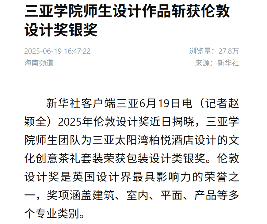 三亞學(xué)院師生團(tuán)隊為三亞太陽灣柏悅酒店設(shè)計的文化創(chuàng)意茶禮套裝榮獲2025年倫敦設(shè)計獎包裝設(shè)計類銀獎。該作品融合海南茶文化與黎族傳統(tǒng)紋樣,以現(xiàn)代設(shè)計語言展現(xiàn)東方美學(xué)。此次獲獎體現(xiàn)了學(xué)校產(chǎn)教融合的成果,是海南文化通過設(shè)計創(chuàng)新走向國際舞臺的成功實踐。