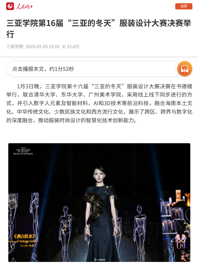 三亞學(xué)院第十六屆“三亞的冬天”服裝設(shè)計大賽決賽近日舉行,大賽聯(lián)合多所高校,引入數(shù)字人、AI與3D等前沿科技,融合多元文化元素。28組學(xué)生作品圍繞民族、時尚等主題展開,最終《溯古躍金》憑借獨特設(shè)計榮獲一等獎。賽事展現(xiàn)了服裝設(shè)計的數(shù)字化創(chuàng)新趨勢,旨在培養(yǎng)新時代服裝設(shè)計人才。
