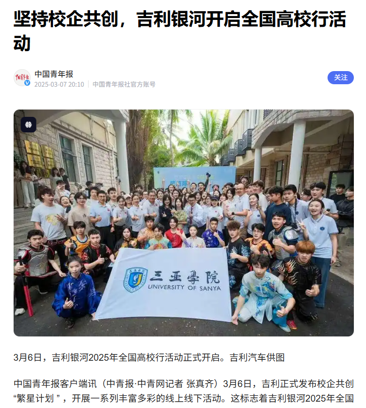 吉利銀河近日正式啟動2025年全國高校行活動,并發(fā)布校企共創(chuàng)“繁星計劃”?;顒右源髮W(xué)生新媒體共創(chuàng)大賽和校園見面會等形式展開,邀請奧運冠軍黃雨婷等與三亞學(xué)院學(xué)子互動交流,旨在為年輕人搭建展示才華、連接企業(yè)的平臺。吉利長期致力于產(chǎn)教融合,已在全國投資創(chuàng)辦多所高校,持續(xù)推動教育鏈與產(chǎn)業(yè)鏈的深度銜接。