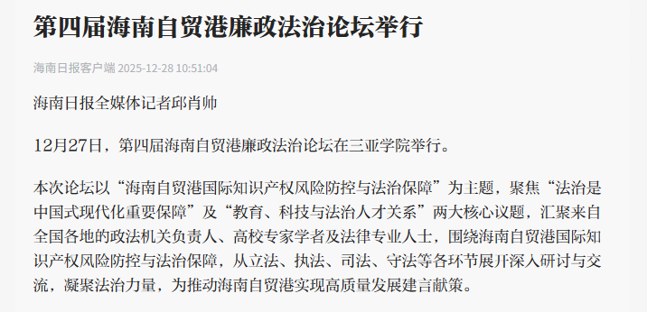 第四屆海南自貿(mào)港廉政法治論壇在三亞學(xué)院舉行。論壇以“海南自貿(mào)港國際知識產(chǎn)權(quán)風(fēng)險防控與法治保障”為主題,聚焦“法治是中國式現(xiàn)代化重要保障”及“教育、科技與法治人才關(guān)系”兩大核心議題,圍繞海南自貿(mào)港國際知識產(chǎn)權(quán)風(fēng)險防控與法治保障,為推動海南自貿(mào)港實現(xiàn)高質(zhì)量發(fā)展建言獻(xiàn)策。