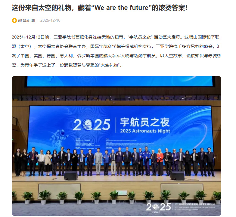 “宇航員之夜”盛大啟幕。多國航天英雄、行業(yè)知名人士跨越山海赴約齊聚,用太空故事、硬核知識與赤誠熱愛,為大家送上了一份滿載智慧與夢想的“太空禮物”,更以“You are the future”的信念,點燃了青年一代的航天夢想,書寫著吉利教育與三亞學(xué)院的社會擔(dān)當(dāng)。