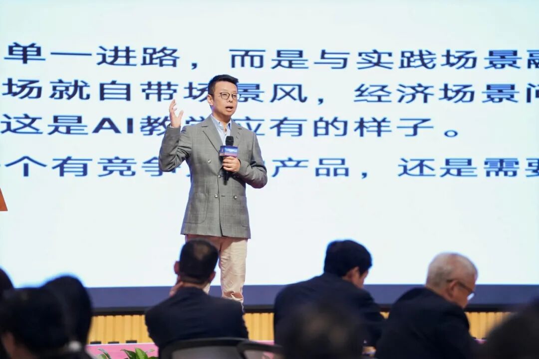 陸丹博士隨后以“知識進階與AI支持”為題,發(fā)表了兼具理論高度與落地價值的的精彩發(fā)言,引發(fā)全場廣泛共鳴。他從教育演進規(guī)律、行業(yè)實踐總結(jié)與未來發(fā)展趨勢三個維度出發(fā),闡述了當前教育創(chuàng)新的深層邏輯與可行路徑。