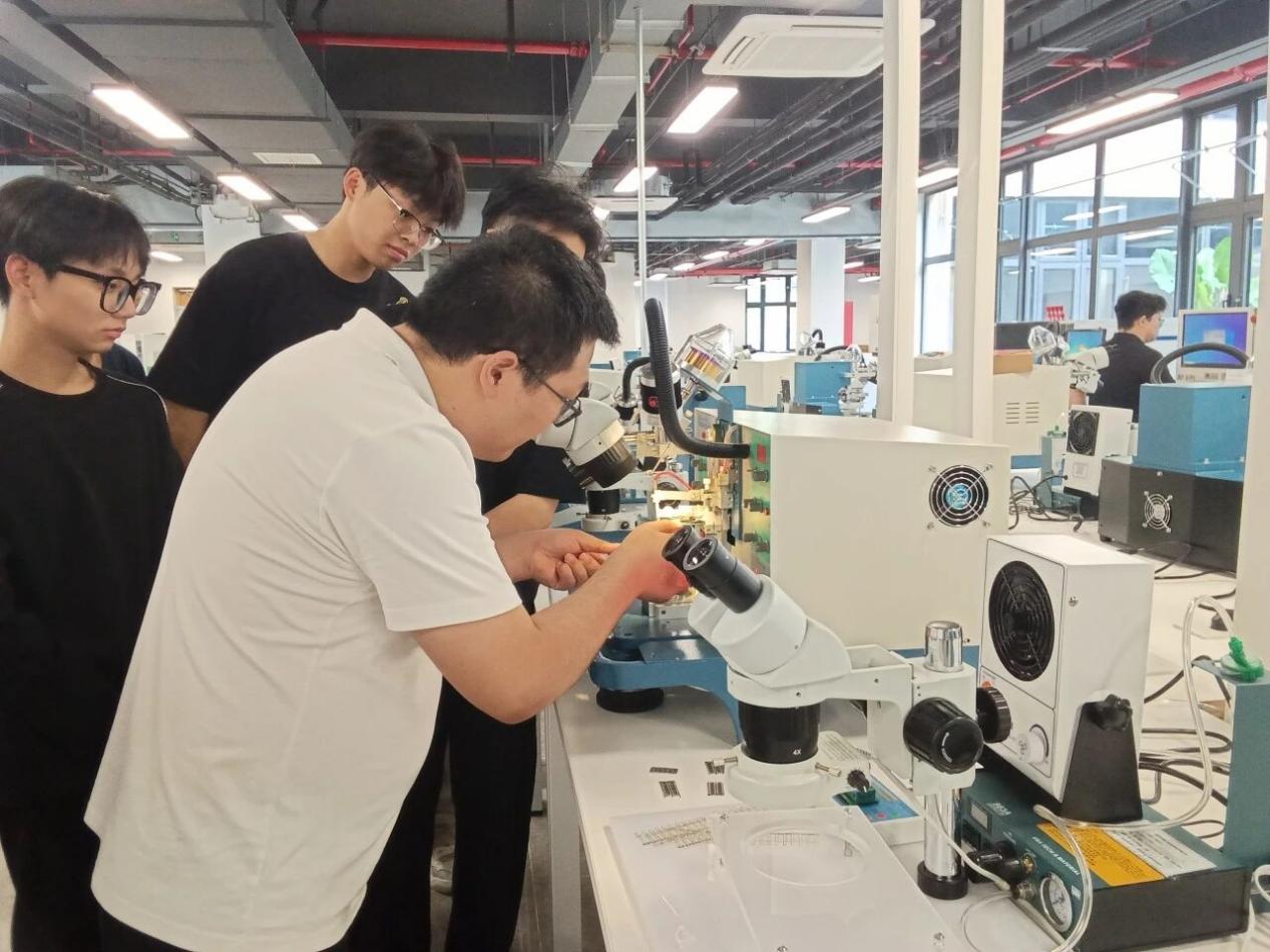 “以前覺得芯片封裝離自己很遠,現(xiàn)在我們可以親手完成從晶圓劃片到測試的全流程,真正理解了工藝背后的原理和質量控制的意義。”一名參與項目的學生感慨道?,F(xiàn)在,學生們親手劃片、鍵合、測試,把“黑箱”拆成了看得見、摸得著的工藝流程,但更不一樣的是上課方式,課程不再讓學生“按部就班”做驗證實驗,而是直接把企業(yè)的真實項目搬進課堂。學生以“產線工程師”“工藝技術員”的身份,分組接單、分工協(xié)作:有人優(yōu)化PCB設計、制定鋼網開孔方案,有人編寫貼片程序、調試爐溫曲線,最后一起完成車規(guī)級可靠性測試。在封裝實驗室,從晶圓劃片到最終測試,每一步都得自己動手、自己負責。