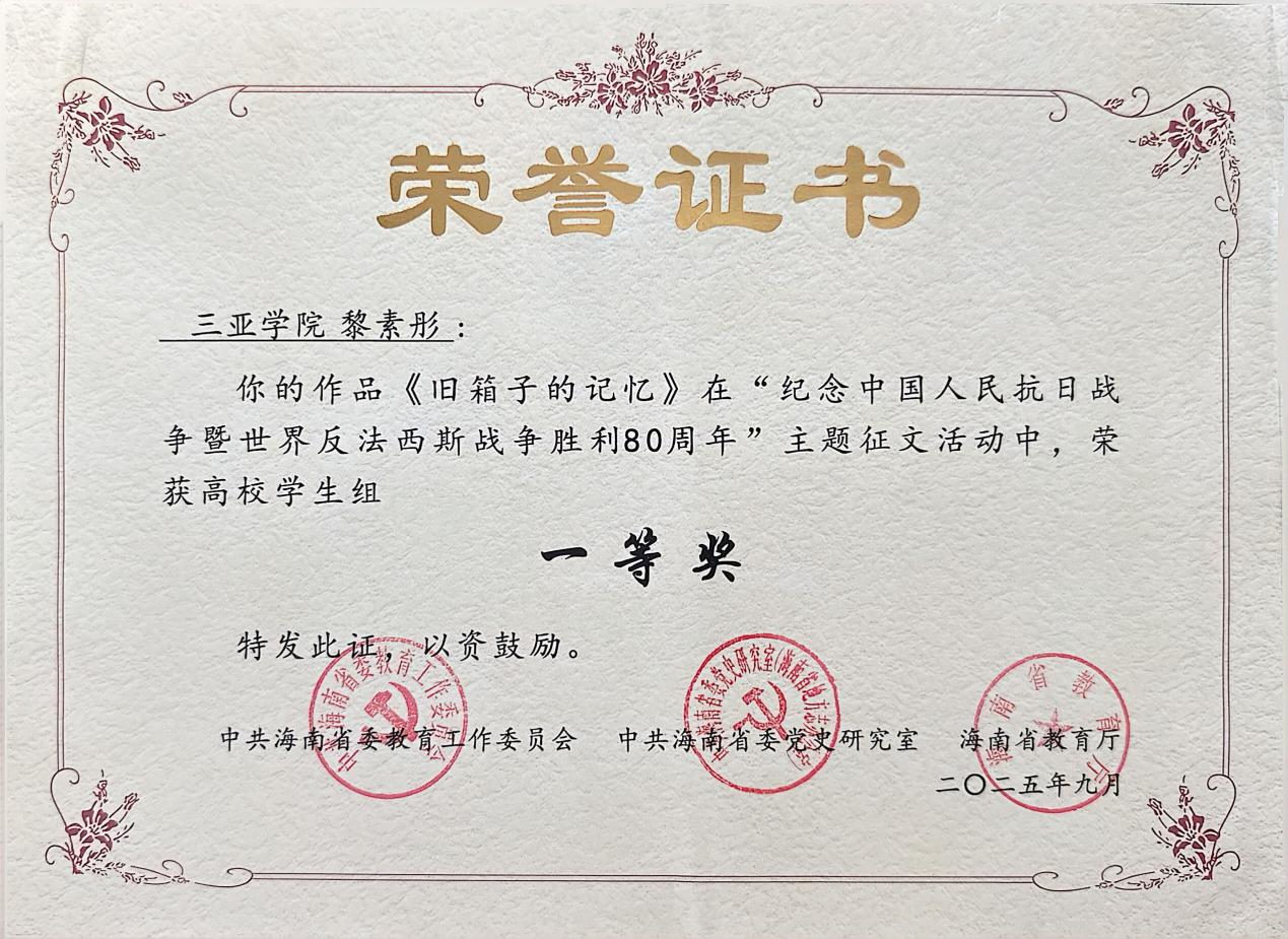 日前,在“紀念中國人民抗日戰(zhàn)爭暨世界反法西斯戰(zhàn)爭勝利80周年”省級主題征文活動中,財經(jīng)學院黎素彤同學的作品《舊箱子的記憶》榮獲高校學生組一等獎。此次活動由海南省委教育工委、省委黨史研究室、省教育廳聯(lián)合主辦,全省高校學子踴躍參與。
