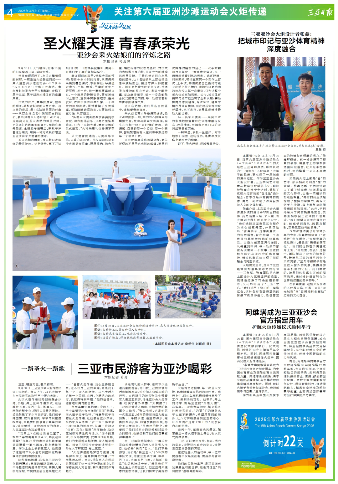 昨日,第六屆亞洲沙灘運動會火炬?zhèn)鬟f儀式在三亞舉行。在這場亞洲體育盛會的聚光燈下,三亞學(xué)院人“站”上了C位——他,張鑫,用設(shè)計點亮“火焰羽翼”,讓三亞學(xué)院的設(shè)計力量隨火炬?zhèn)鬟f;她,吳佳琳,作為主采火手,將青春朝氣注入圣火采集的莊嚴瞬間;她們,高源、賈雙瑞、董慧玲,以采火使者的身份,讓亞沙圣火映照出三亞學(xué)院人的熱血與擔當。從圣火采集到火炬接力,從校園到國際賽場,這不是簡單的參與,而是“產(chǎn)教融合”最燃的打開方式——讓學(xué)子在真實場景中成長,更好地走向社會,也為三亞這座熱帶濱海城市注入滾燙的青春能量!