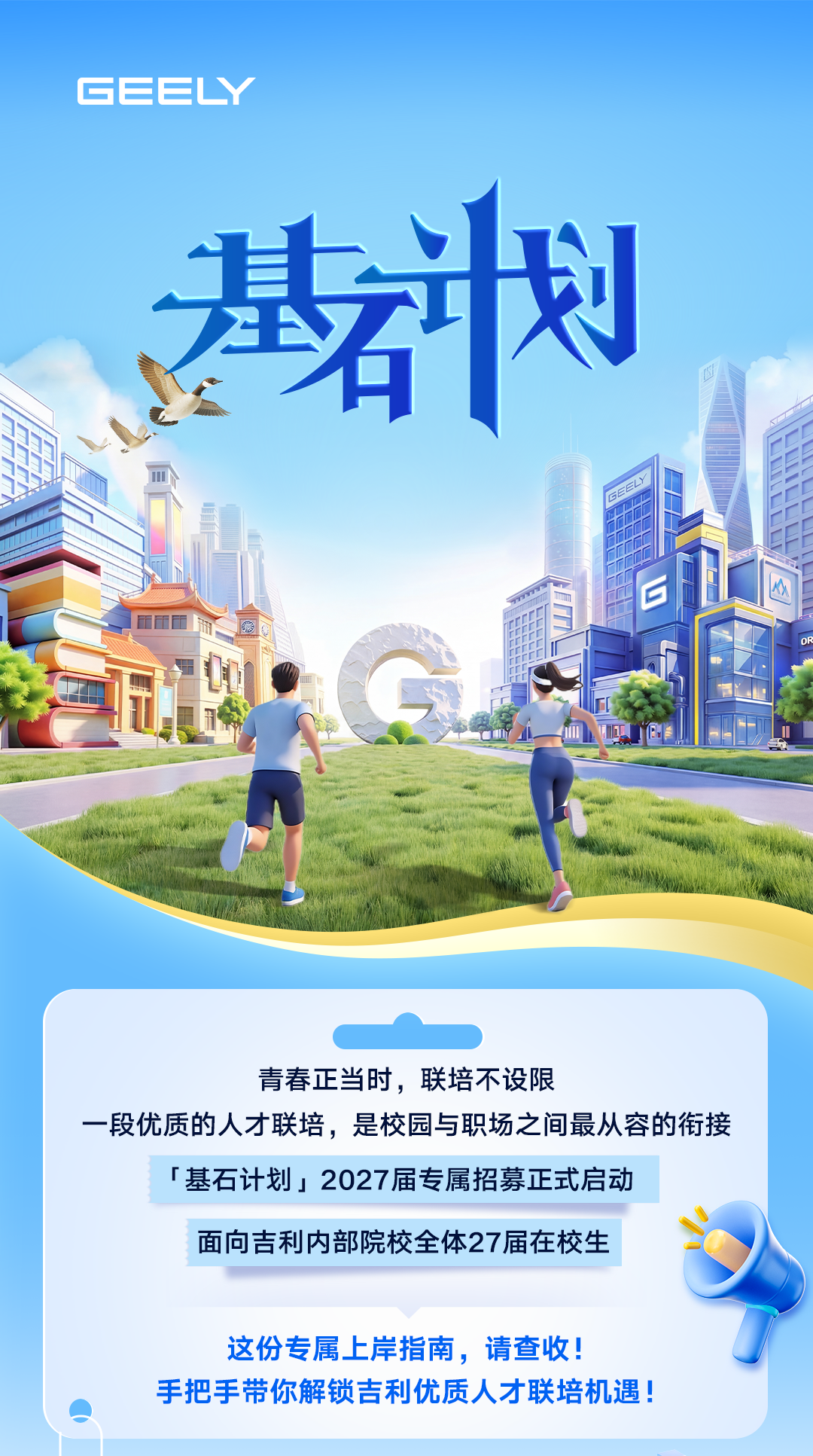 This is Geely’s exclusive HR talent development program. Through one year of systematic internship before graduation, students integrate into corporate scenarios in advance and become familiar with core HR workflows including recruitment and business BP roles, comprehensively improving capabilities in talent recruitment, organizational empowerment and business collaboration. Guided by long-term career development, the project provides continuous training and targeted empowerment, building a group of HR backbones and reserve talents who are professional, business-savvy and collaborative, providing solid talent support for the construction and high-quality development of Geely’s human resources system.