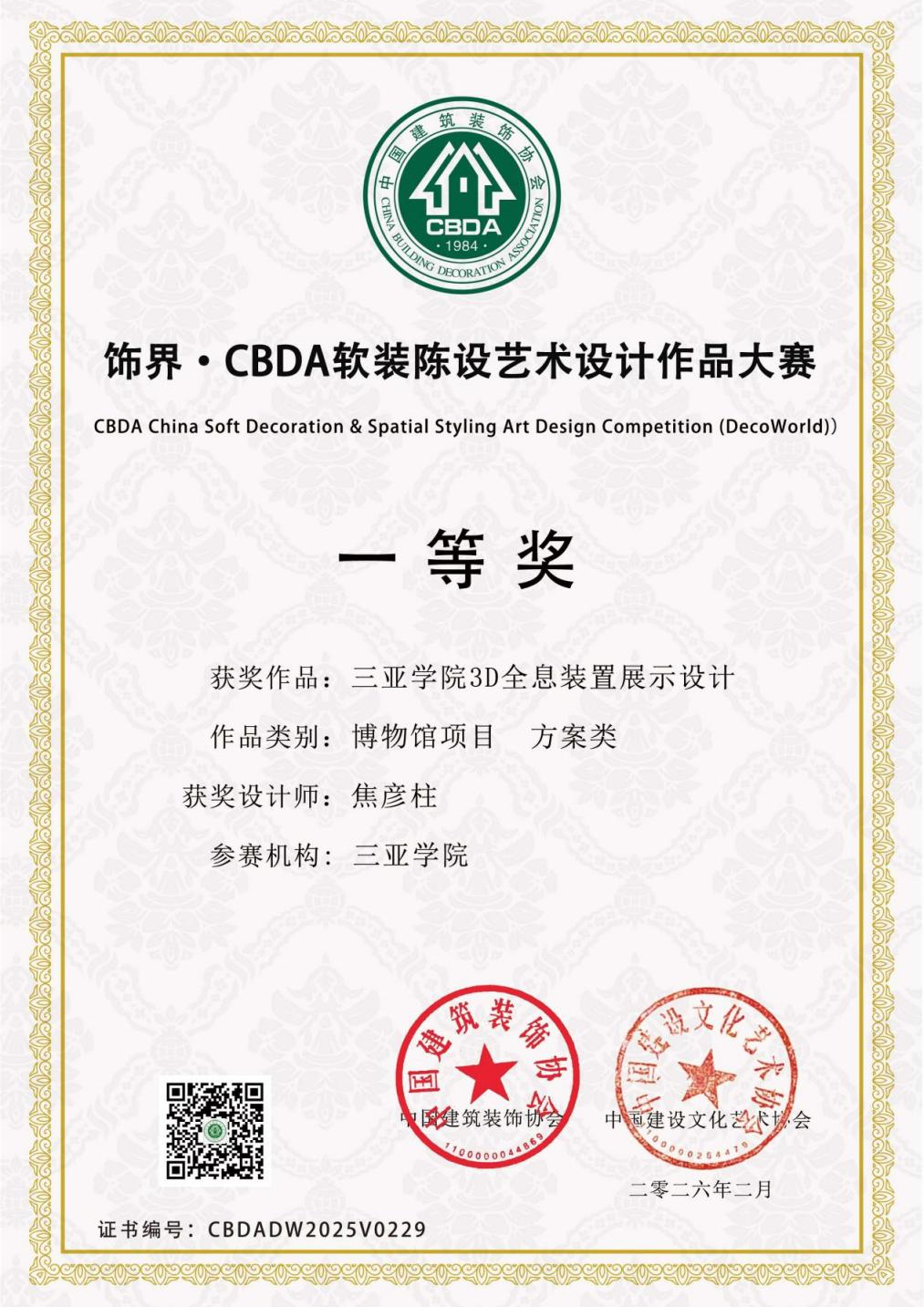 近日,2026年度飾界?CBDA 軟裝陳設(shè)藝術(shù)設(shè)計(jì)作品大賽評(píng)選結(jié)果公布,三亞學(xué)院藝術(shù)創(chuàng)意與數(shù)字設(shè)計(jì)學(xué)院焦彥柱老師憑借三亞學(xué)院3D全息裝置展示設(shè)計(jì),榮獲博物館項(xiàng)目方案類一等獎(jiǎng)。